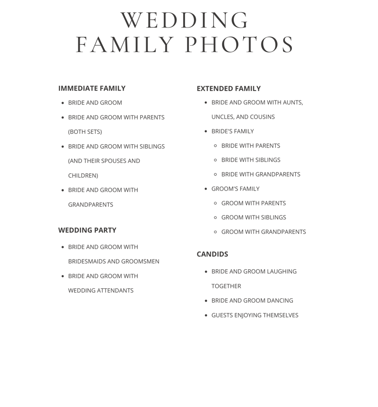 Having a list will save so much time & make the process so simple! The reason we ask for names of family members is because it guides us with our favorite part about wedding photography, CONNECTING with people!